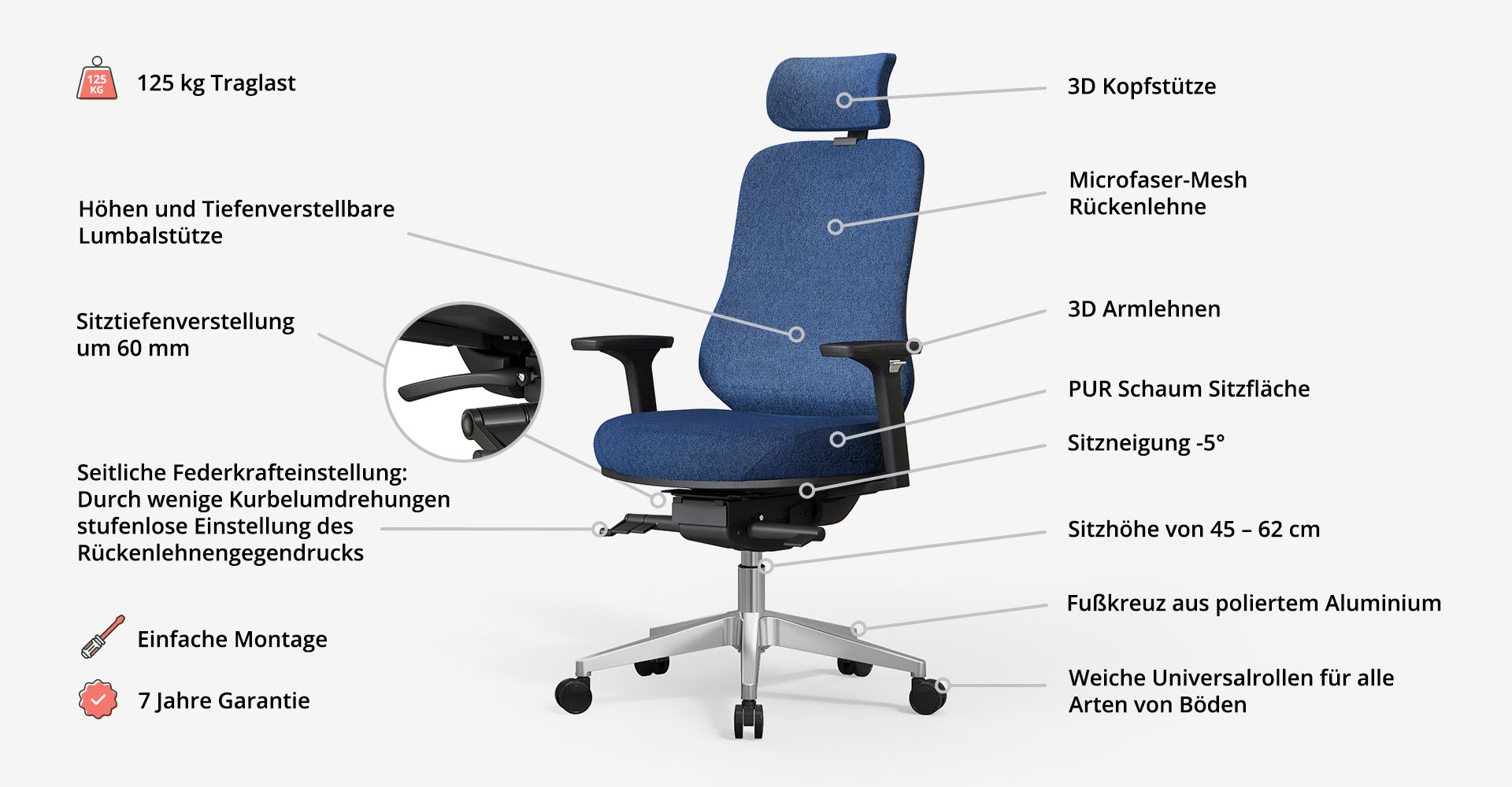Die wichtige ergonomische Funktion der höhen- und tiefenverstellbaren Lordosenstütze unterstützt die Lendenwirbelsäule sowie die natürliche S – Form der Wirbelsäule optimal. Damit wird einem Rundrücken aktiv entgegengewirkt.