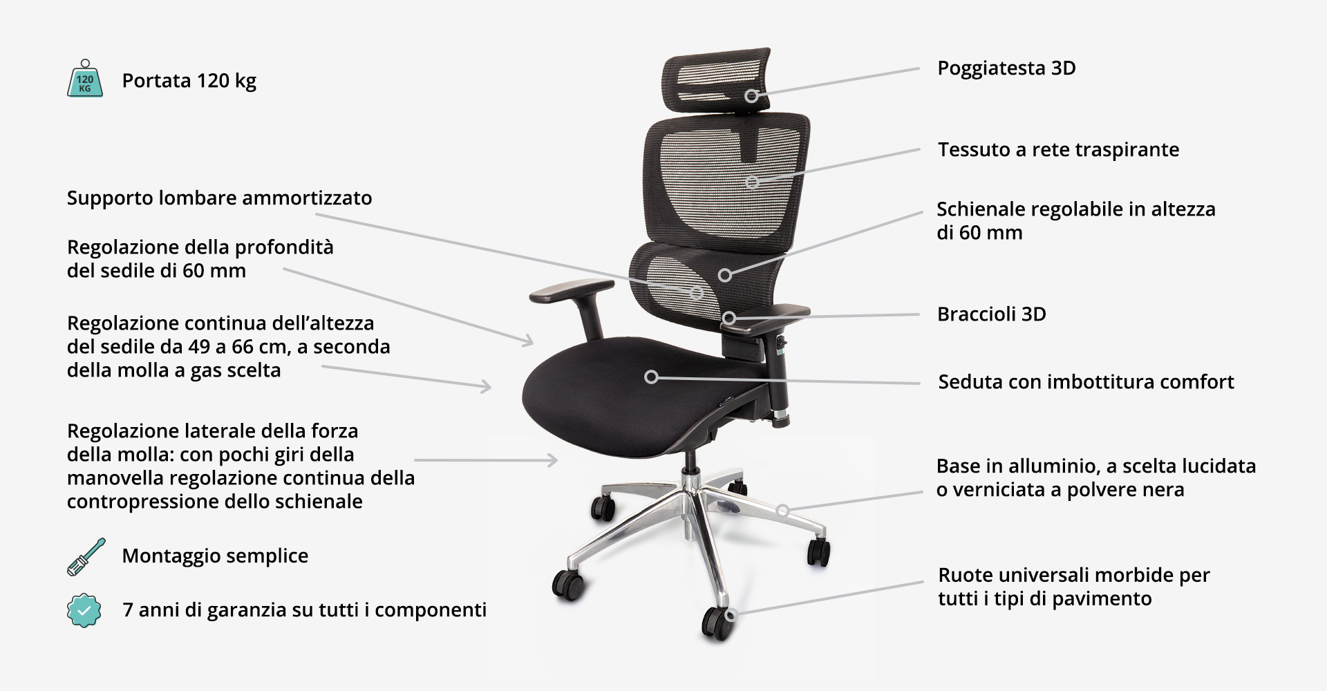 - Capacità di carico: 120 kg