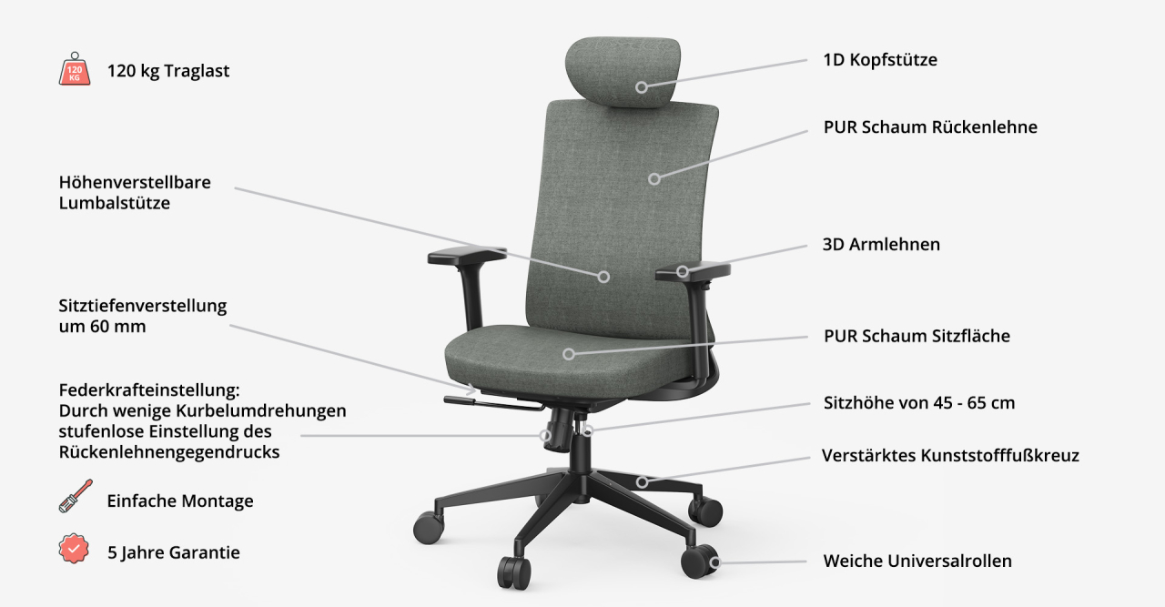 Sedia da scrivania anti-affaticamento per la schiena con poggiatesta e tutte le funzioni importanti per iniziare a sedersi in modo ergonomico.